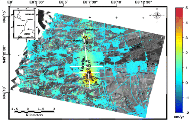 Kuva 1. InSAR satelliittikuva maannoususta Landaun kaupungissa verrattuna sen ympäristöön.